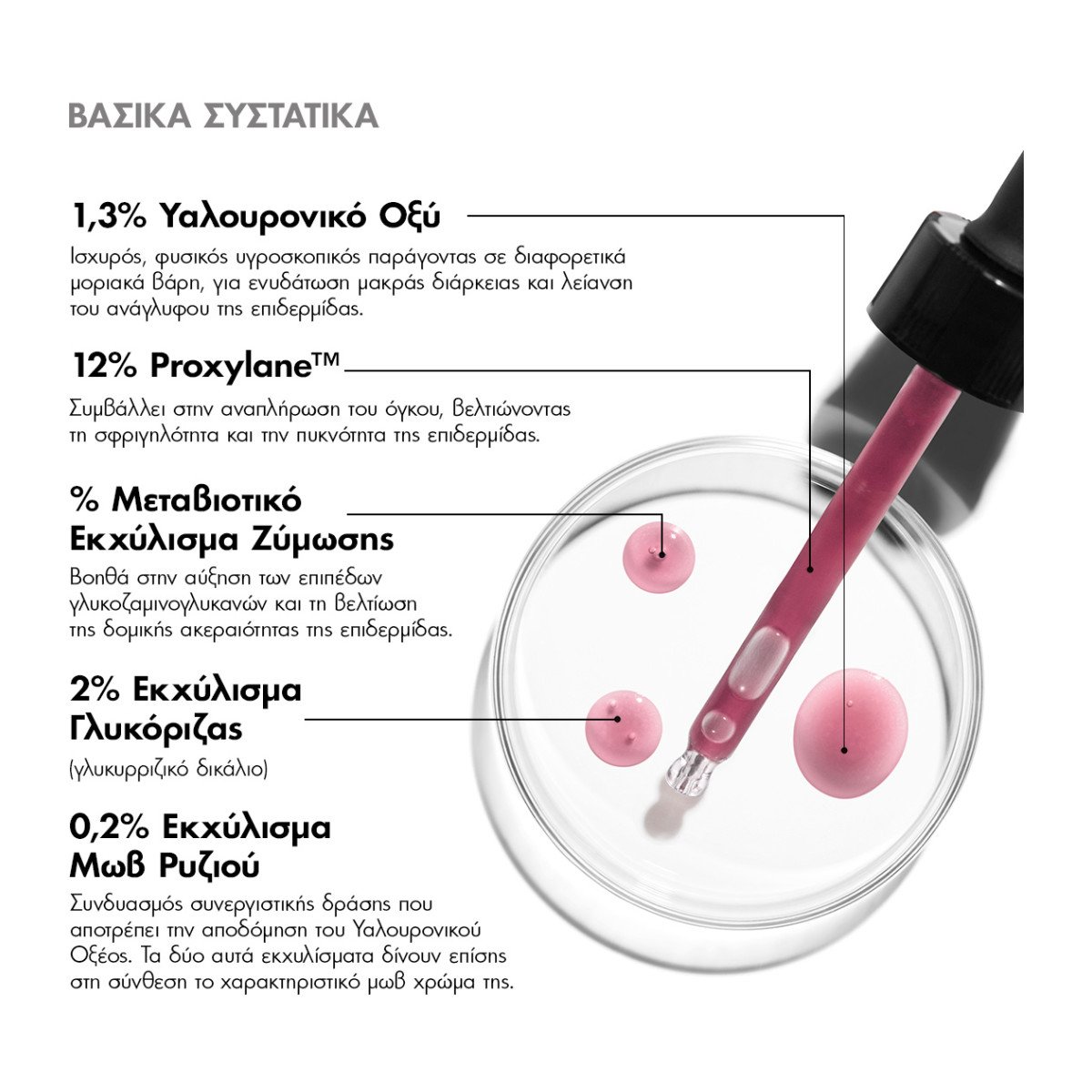 Το HA Intensifier Multi-Glycan είναι ένας νέας γενιάς ορός διόρθωσης που έχει αποδειχθεί ότι αυξάνει τα φυσικά επίπεδα Υαλουρονικού Οξέος στο δέρμα κατά 30%. Η προηγμένη αυτή σύνθεση περιέχει καθαρό Υαλουρονικό Οξύ σε υψηλή συγκέντρωση 1,3%, Proxylane™ σε ποσοστό 12%, καθώς και ένα νέο μεταβιοτικό εκχύλισμα ζύμωσης, για αύξηση των γλυκοζαμινογλυκανών, όπως το Υαλουρονικό Οξύ, και διατήρηση των επιπέδων τους στις ανώτερες στιβάδες του δέρματος. Αμέσως, η επιδερμίδα ανακτά τη ζωντάνια της και παραμένει ενυδατωμένη έως και 24 ώρες. Σε βάθος χρόνου, η ελαστικότητα και η σφριγηλότητα βελτιώνονται, ενώ το περίγραμμα του προσώπου επανασμιλεύεται. Ο ορός αυτός δεν περιέχει paraben, άρωμα, ούτε χρωστικές, και μπορεί να χρησιμοποιηθεί για την καθημερινή περιποίηση της επιδερμίδας μετά από ενέσιμα fillers. Για βέλτιστη χρήση στο σπίτι, συμβουλευθείτε τον γιατρό σας.